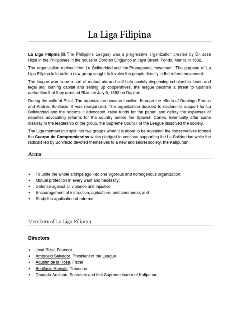 The Filipino Reformist Movement Called La Liga Filipina Travelandculture Blog. 6.whenever any member desire to give the la liga filipina a sum in excess of fifty pesos, he shall deposit the sum in a safe bank, under his vulgar name and then. La liga filipina was founded in 1892 by jose rizal. The rich members wanted to continue supporting the propaganda movement; Jose rizal established la liga filipina, a civic association, in the house of doroteo ongjunco at ilaya street, tondo, manila on july 3, 1892. But the others seemed to have lost all hope that reforms could still be granted. La liga filipina's membership was active in the beginning; It was founded by josé rizal in the house of doroteo ongjunco at ilaya street, tondo, manila on july 3, 1892. The organization derived from la solidaridad and the propaganda movement. Rizal was a filipino revolutionary and writer who lived from 1861 to 1896. Almost simultaneously with the introduction of masonry in the philippines, a civic society called la propaganda was established. Its members, composed mostly, of not exclusively, of the middle class, contributed money to defray the expenses of the filipino reformers in spain who. Andres bonifacio was one of those who believed that. But later, they began to drift apart. 'the philippine league') was a secret organization. The la liga filipina aimed to unite the philippines, to protect the want and necessity of everyone, to defend against violence and injustice, to have the encouragement of.